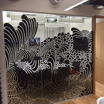 RHM were asked to apply this complex black pattern to the interior glass panels within an office interior to provide privacy screening without totally blocking out the glass. The graphics are printed onto optically clear vinyl using a clever process to ensure the black is opaque. First, the design is printed in a layer of black ink. This is then covered in an identically placed layer of white ink, which is again topped in a layer of black ink. The finished design allows for privacy without completely blocking out external light or closing the space in.
